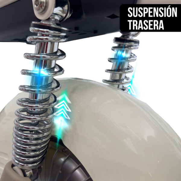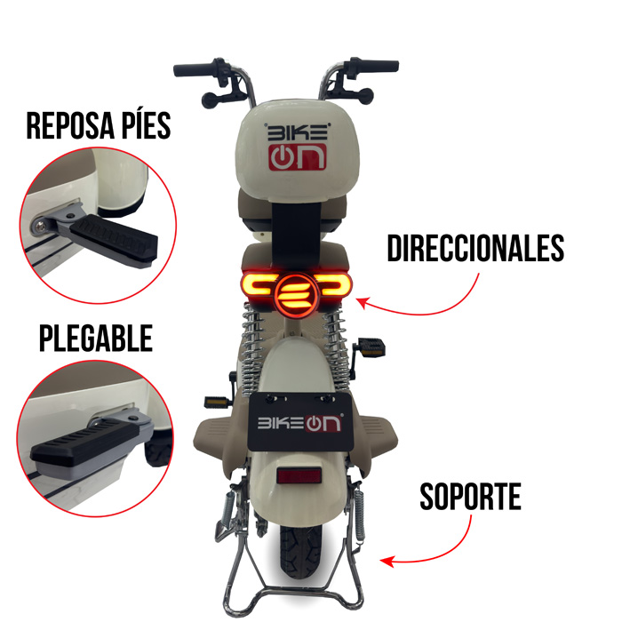 Equipada con suspensión delantera y trasera, frenos de tambor y luces LED delanteras y traseras, esta bicimoto ofrece una conducción suave y segura. Además, cuenta con canastilla delantera, parador lateral y tipo moto, encendido con llave, control remoto con alarma antirrobo y tablero digital. Puede subir pendientes de hasta 15°, lo que la hace ideal para entornos urbanos planos o con ligera inclinación.