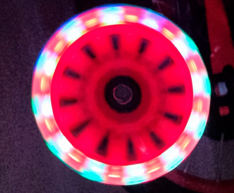 - Llantas Desmontables con Luces de Colores: Las llantas no solo son desmontables para facilitar el transporte y almacenamiento, sino que también vienen con luces de colores que hacen cada paseo aún más divertido y visible en condiciones de poca luz.